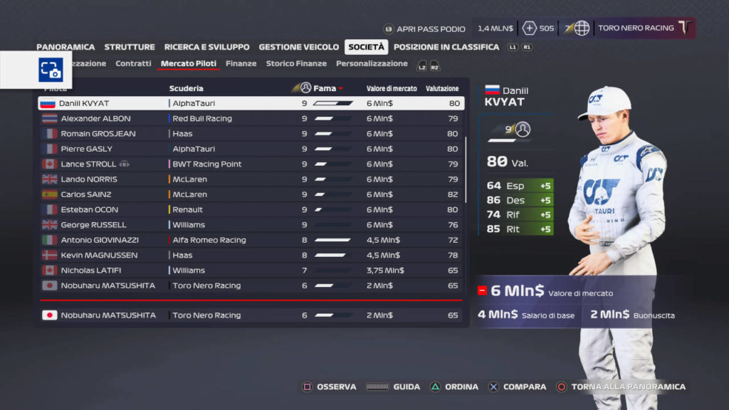 La prima posizione di questa prima metà di classifica è occupata dal compagno di squadra di Gasly nella scuderia faentina: Daviil Kvyat. Così come Ocon anche il pilota russo è riuscito a riprendersi un posto in Formula 1, dimostrando di avere ancora molto da dire, come testimonia l’ottimo terzo posto nel GP di Germania della scorsa stagione. Noi, in ogni caso, tifiamo anche per lui!