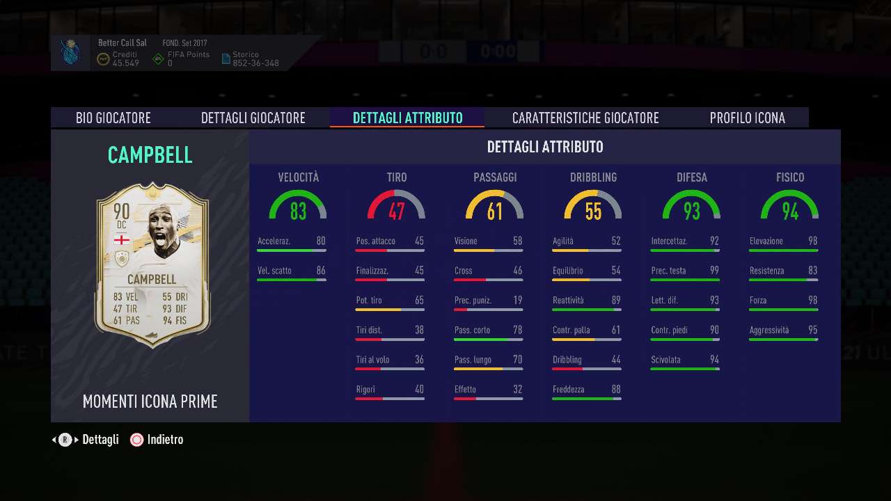 L’unica pecca della carta è rappresentata dall’agilità e dall’equilibrio, che lo rendono in alcune occasioni troppo macchinoso nel ritornare nella posizione esatta, magari subito dopo un recupero di palla o una marcatura più complicata. Per il resto, comunque, Sol Campbell nella sua versione Prime Moments rappresenta una sicurezza, per tutti i tipi di giocatori, e considerando anche il prezzo di acquisto o il costo della sfida, ci sentiamo di consigliare a tutti di sbloccarlo, specialmente se avete bisogno di un centrale dal sicuro affidamento.