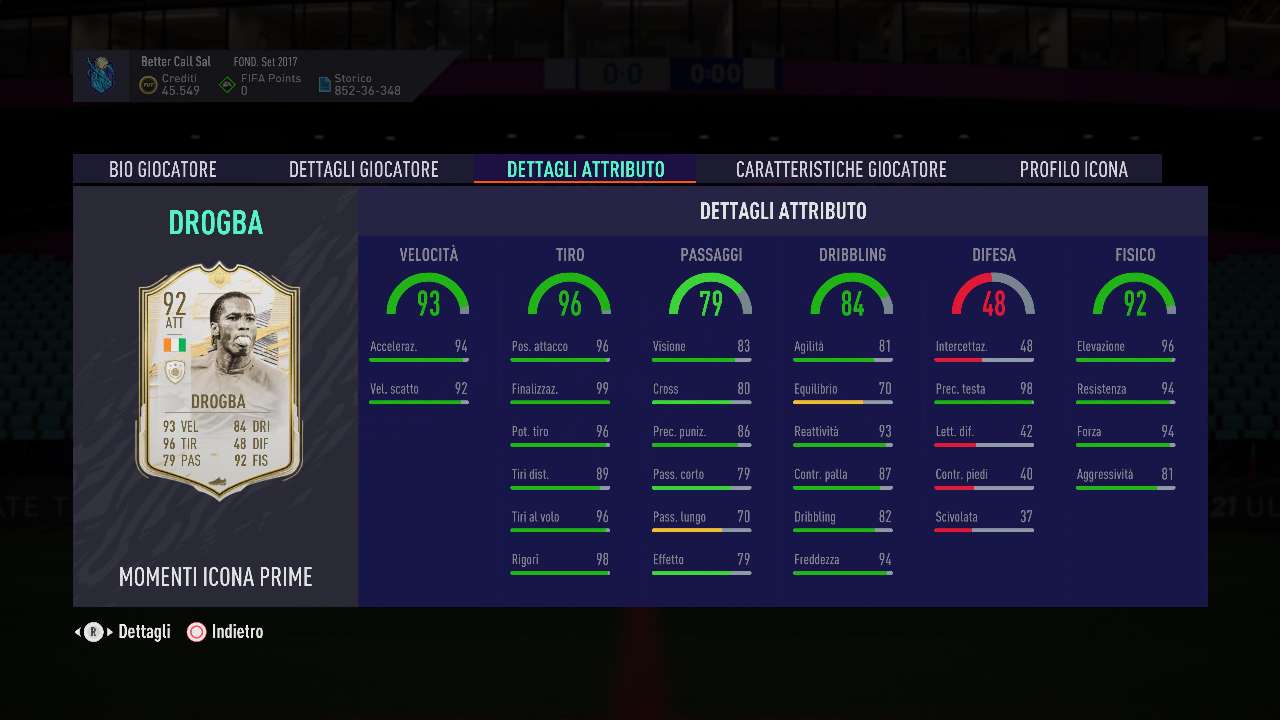 La seconda carta Icon disponibile è quella dedicata a Didier Drogba, uno degli attaccanti più forti e prolifici della storia recente del calcio internazionale. Il buon Didier, nella versione Prime Moments, è un giocatore mostruoso, almeno stando alle statistiche che, specialmente per quelle di tiro, appaiono veramente strepitose. Analizzando per bene la carta, e soprattutto provandola con mano, ci si accorge, invece, del fatto che questo giocatore possiede dei limiti importanti, soprattutto a causa dei valori di agilità e soprattutto di equilibrio (solo 70) veramente ingombranti, calcolando anche la stazza e il body type del giocatore.