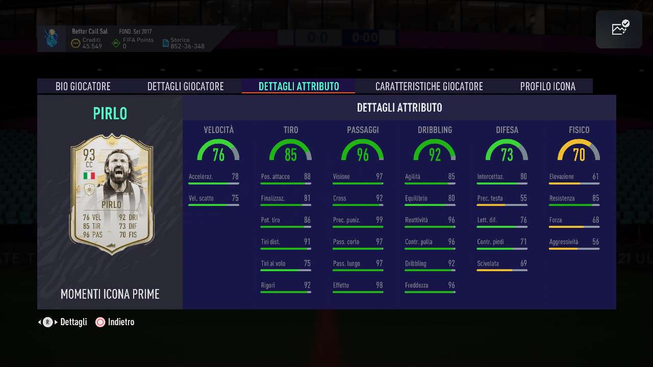 Sia chiaro, a livello di passaggi e di controllo di palla è assolutamente clamoroso, ma considerando proprio la scarsa velocità e la scarsa resistenza diventa impossibile schierarlo anche come COC, il ruolo probabilmente più indicato per le sue stats. Nel complesso, dunque, la card Icon dedicata ad Andrea Pirlo non è esattamente una delle più imprescindibili e probabilmente è pensata esclusivamente per i fan del giocatore che si dilettano sui server di FIFA 21, piuttosto che chi cerca un vero e proprio player “meta” o comunque utilizzabile.