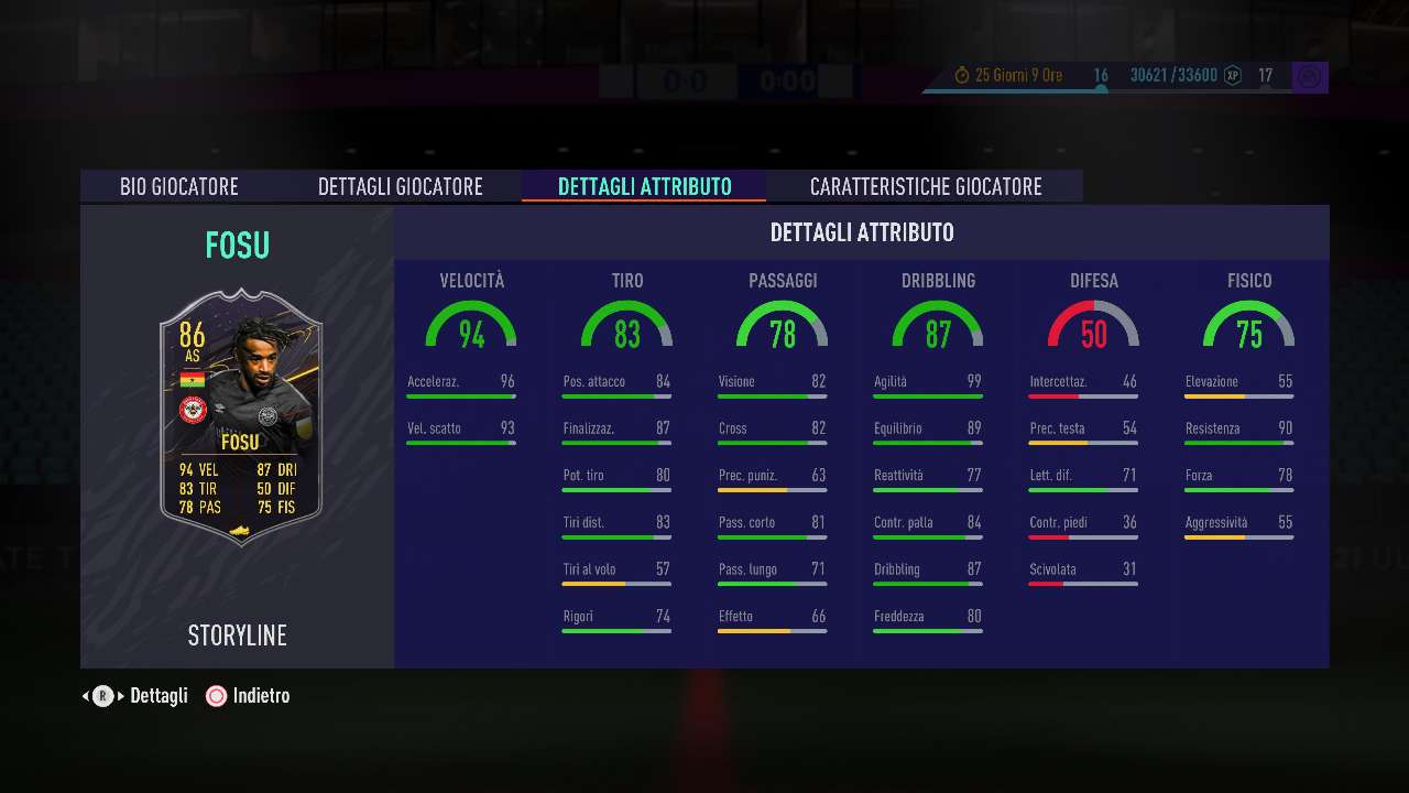 La seconda opzione è quella relativa all’esterno del Brentford (seconda divisione inglese), il ghanese Tariq Fosu. Ancora una volta, carta alla mano, il giocatore sembra devastante, grazie a dei parametri di velocità e agilità assolutamente incredibili, uniti ad una buona finalizzazione e ad un passaggio accettabile, ma a compromettere il giocatore sono ancora una volta le abilità “fisiche”. Le stelle skills stavolta sono 4, sempre poche per un giocatore in quel ruolo, ma il vero problema è rappresentato dal 3 alla voce “piede debole”, cosa che lo rende molto prevedibile. Certo, i workrate sono giusti e alla fine come super sub può fare la differenza, ma non ci sentiamo di dirvi che si tratti di un piccolo campione.