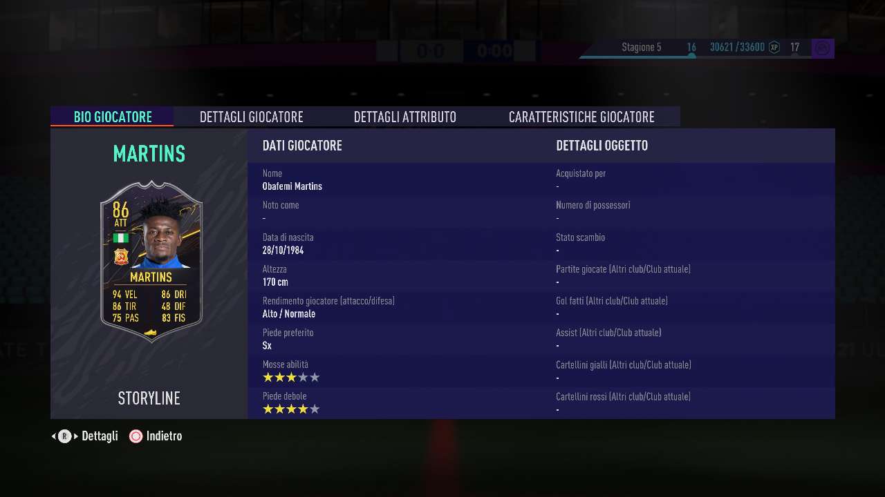L’opzione meno consigliata della prima ondata di ricompense è sicuramente quella dedicata all’ex calciatore dell’Inter “Oba-Oba” Martins, ora militante nel campionato cinese. Sia chiaro, statistiche alla mano il centravanti nigeriano sembra avere tutte le carte in regola per risultare un ottimo elemento, ma rovinarne la carta ci pensano le stelle skill, soltanto tre. Questo dettaglio lo rende inevitabilmente poco agile e prevedibile in game, cosa che per un attaccante, con il gameplay di FIFA 21, non è assolutamente permissibile.