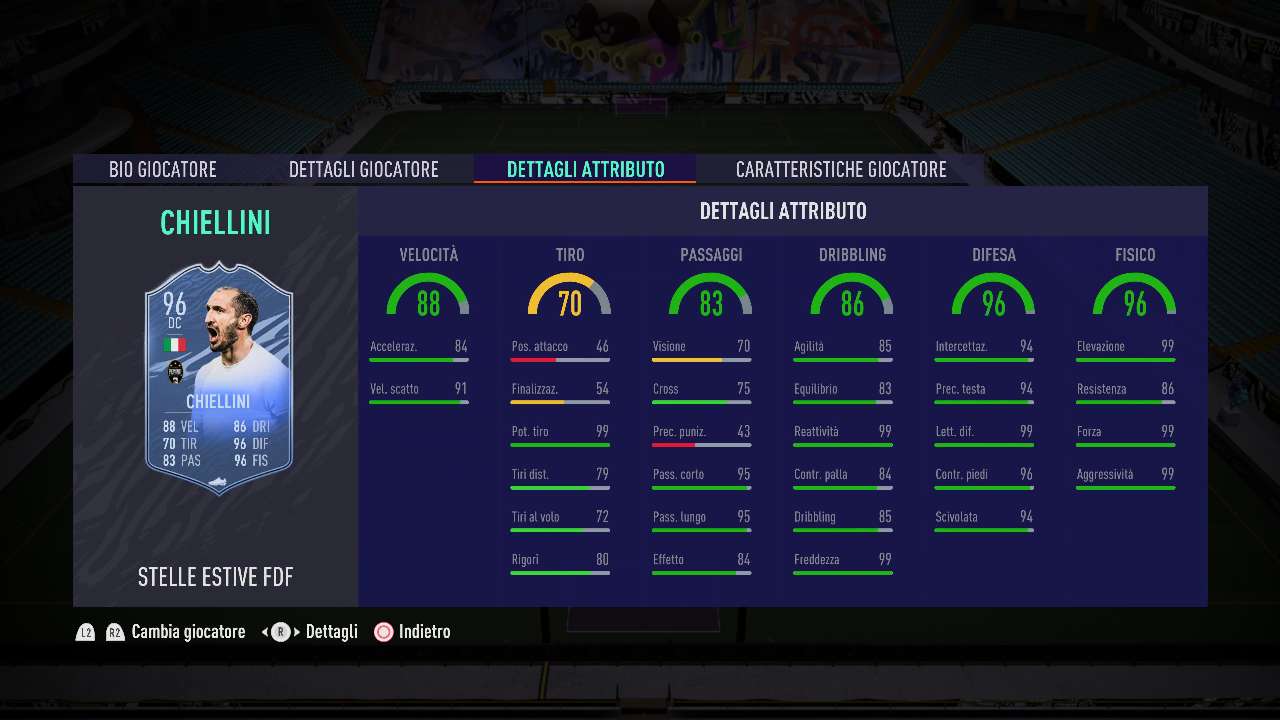 Ultimo tassello di questo gruppo di cinque giocatori è sicuramente il gigante della Juventus e della nazionale italiana Giorgio Chiellini, reduce anche da un campionato Europeo giocato da protagonista e vinto insieme al gruppo d’oro creato da Coach Mancini. Nella nuova versione il buon Giorgio appare praticamente perfetto, con un boost incredibile alla velocità, unica sua pecca nelle versioni base. Per il resto, tutto semplicemente al top: difesa, fisico e controllo palla lo rendono un centrale insostituibile, specialmente per chi possiede un team della Serie A.