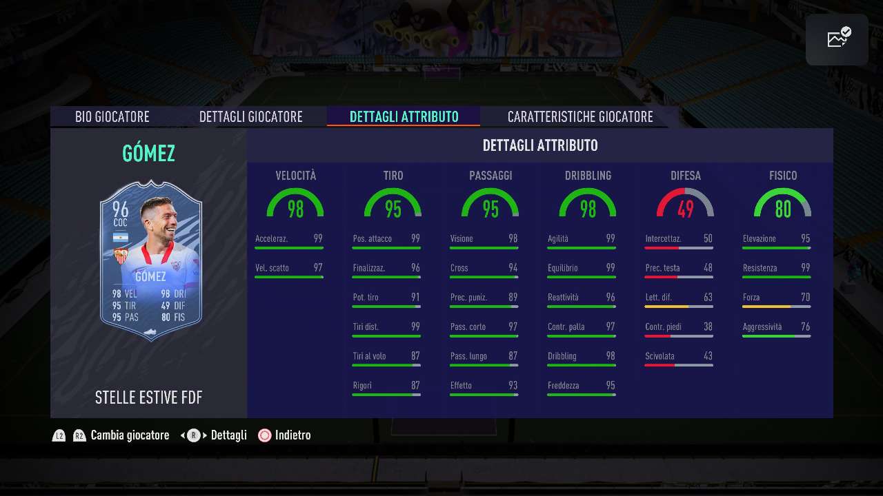 Al quarto posto del nostro ranking troviamo il buon vecchio Papu Gomez, vecchia gloria del calcio italiano che sta facendo molto bene nel Siviglia. Nella versione Summer Stars il buon Papu guadagna 9 punti al tiro, 6 al passaggio e 6 al dribbling, numeri che lo rendono un vero e proprio funambolo in mezzo al campo, nonché estremamente affidabile sotto porta. Il fatto poi che abbi ricevuto un +1 alle stelle piede debole (da 4 a 5) lo rende ancor più spietato nella fase finale dell’azione e considerando anche il prezzo di mercato del giocatore lo reputiamo uno dei migliori giocatori disponibili per rapporto qualità-prezzo.