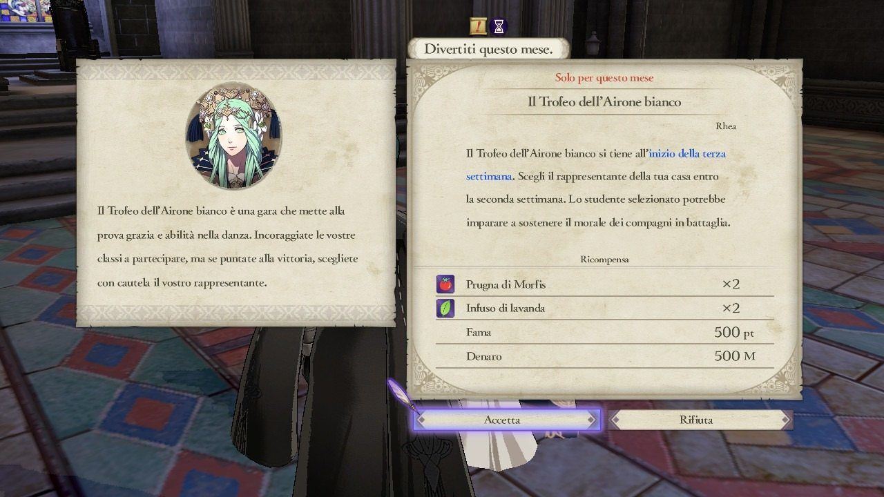 L’unica possibilità per ottenere questa classe è nel Capitolo 9, durante il dodicesimo mese in game. Dall’inizio del mese l’Arcivescova Rhea vi affiderà la missione “Il Trofeo dell’Airone bianco“, che consisterà in una gara di ballo tra le casate. Il nostro compito sarà selezionare uno dei nostri studenti che prenderà parte alla competizione che si terrà il 16/12. La missione andrà portata a termine nelle due date disponibili per farlo, ovvero il 7/12 o il 14/12.