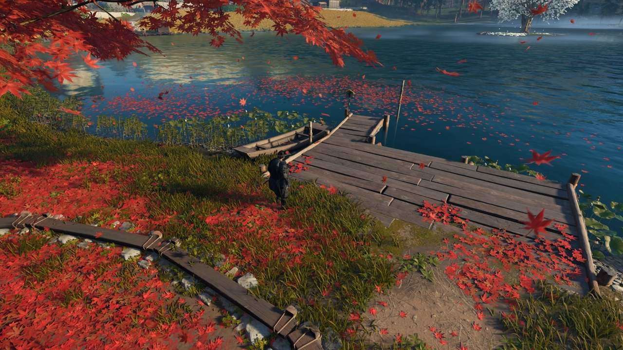 Partendo dalla posizione precedente, continuate a costeggiare il Lago di Omi verso sud e arriverete all’albero con le foglie rosse che dovreste aver già visitato durante la storia di Ghost of Tsushima. Lì vicino c’è una pedana di attracco di legno con l’ultimo cartello. Inchinatevi e vedrete dei pesci saltare fuori dall’acqua.