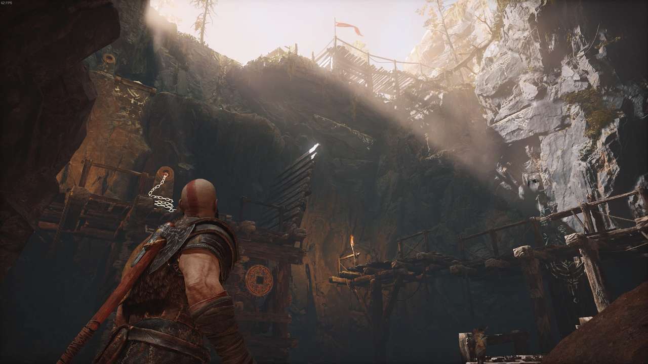 Partendo dal ponte posteriore, vai a sinistra e arrampicati sul ponte superiore. Guarda a destra, vicino alla rupe, e vedrai un braciere dietro una grata. Muoviti a sinistra più che puoi per ottenere un buon punto da cui poter mirare al barile esplosivo che sta dietro la grata a sua volta. Colpiscilo con la tua ascia per accendere il braciere e sbloccare lo scrigno.