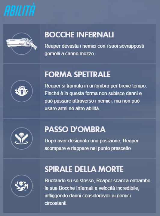 Il kit di Reaper rappresenta al 100% il personaggio stesso, con abilità che gli permettono di penetrare la linee nemiche non visto, ma facendo comunque percepire la sua presenza ai nemici, che potranno solo attendere di vederlo spuntare dalle ombre