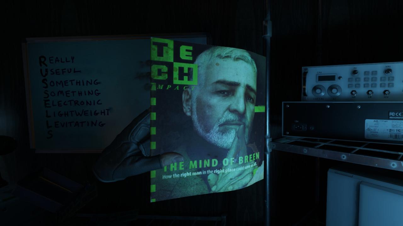 Sempre nel laboratorio di Russel (vi giuro che è l’ultimo) si potrà scorgere una rivista chiamata Tech Impact, un chiaro omaggio alla rivista Wired. La copertina ritrae il Dr. Wallace Breen con sotto il titolo “The Mind Of Breen”. Il sottotitolo dice “Come l’uomo giusto nel posto giusto potrebbe salvarci tutti”. Questo è ovviamente evocativo del monologo di apertura di G-Man in Half-Life 2 – “L’uomo giusto nel posto sbagliato può fare la differenza nel mondo”.