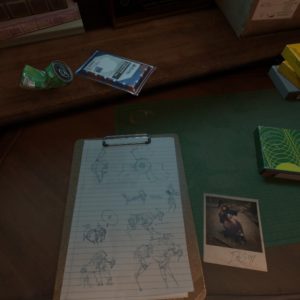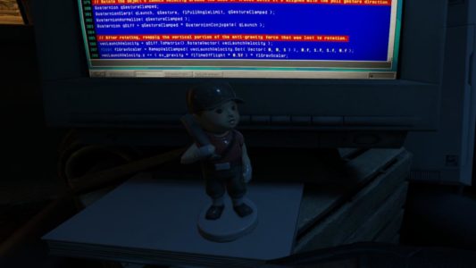 Una volta raggiunto il laboratorio di Russell, ci sarà molto da scoprire. Una volta entrati, nell’immediata destra ci sarà un monitor CRT. Se acceso, si potrà riconoscere il duro lavoro del progetto dei guanti gravitazionali. Più di una dozzina di file in C ++ disseminano il desktop. Il cestino è anche chiamato “inceneritore” – forse un riferimento a Portal?