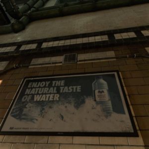 Durante il gioco, ci sono tonnellate di manifesti che pubblicizzano Mountain Peaks, un marchio di acqua in bottiglia. Questo è probabilmente un riferimento alla voce diffusa in Half-Life 2 che i Combine abbiano manomesso l’approvvigionamento idrico per controllare i cittadini durante l’invasione. Come spiega un cittadino che abita in una stazione ferroviaria: “Non bere l’acqua… ci mettono qualcosa per farti dimenticare. Non ricordo nemmeno come sono arrivato qui”.