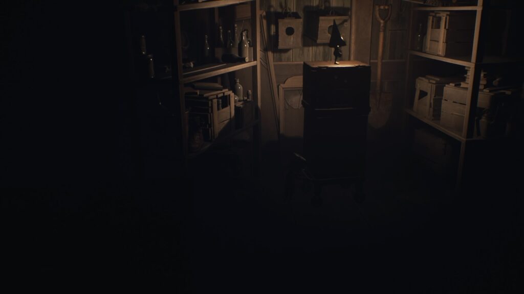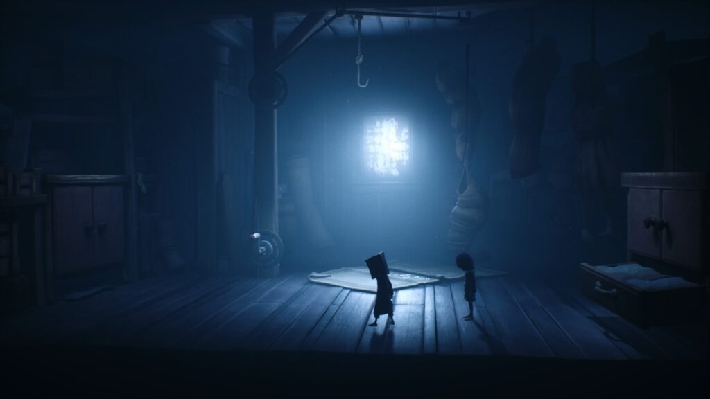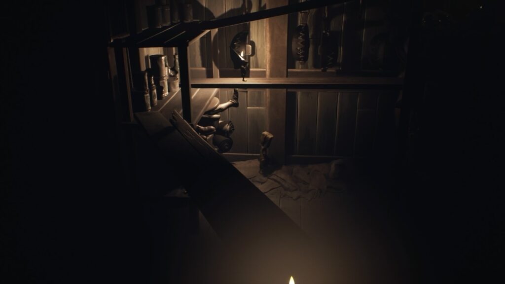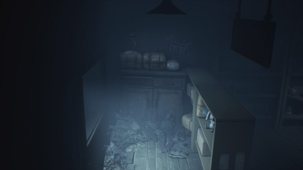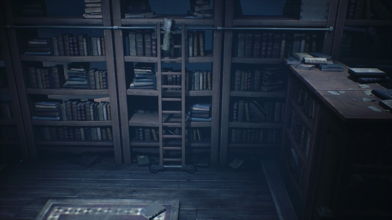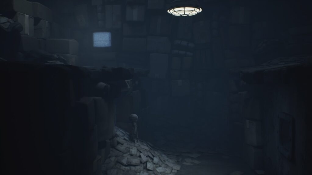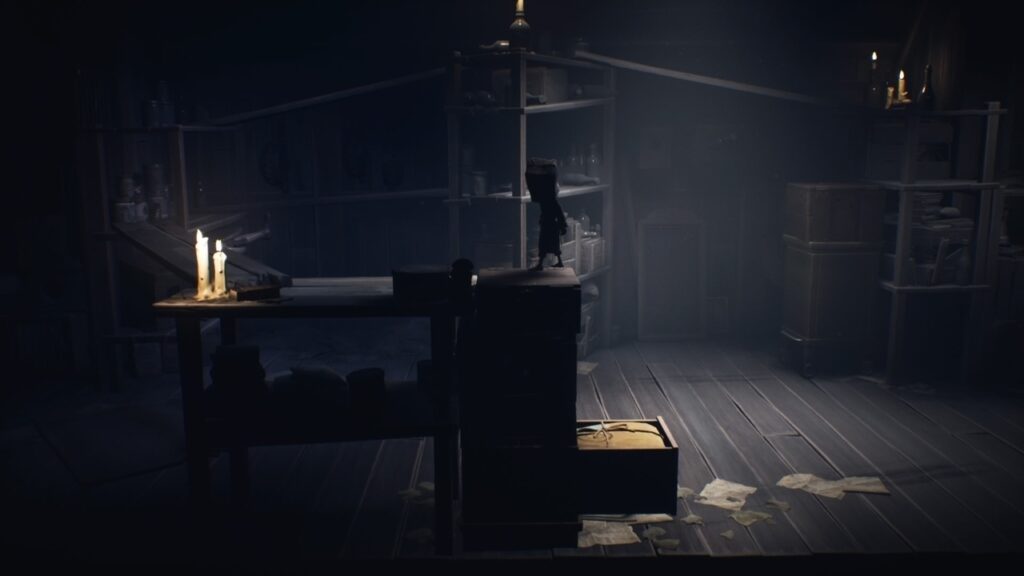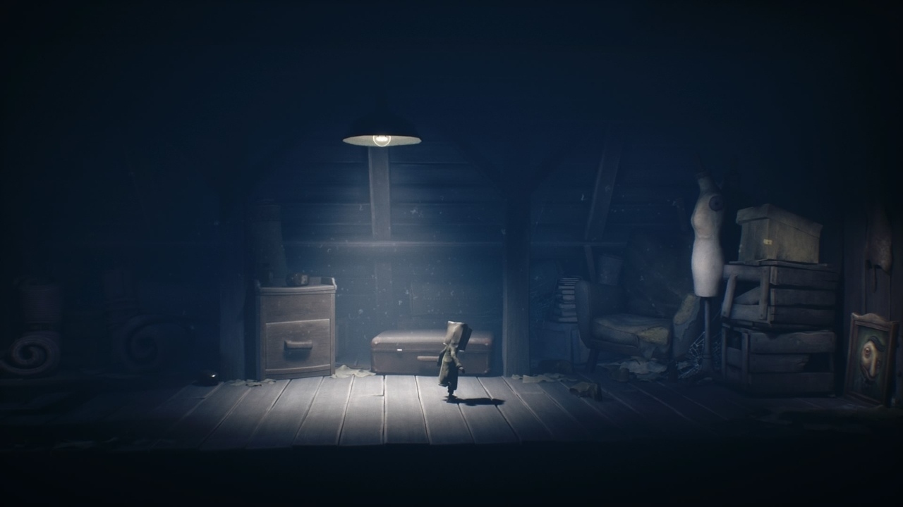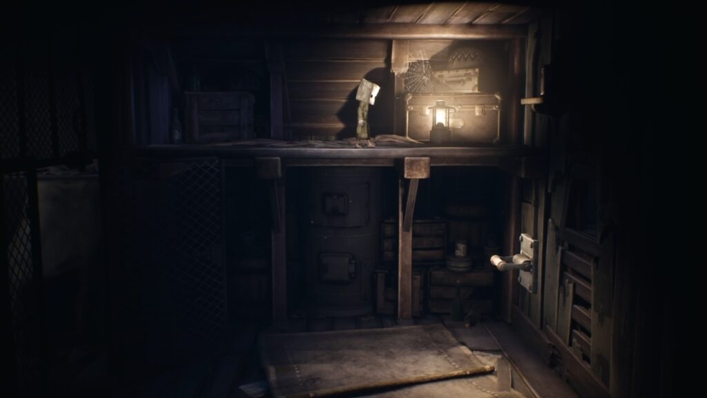 Seguite quindi il nomino nella prossima stanza. Qui egli vi seguirà dall’alto a seconda di dove vi dirigerete, quindi aspettate che vi segua prima di proseguire. Andate verso la parte alta della stanza, proseguite verso destra e oltrepassate lo scaffale; afferrate il carrello e spostatelo a sinistra, in modo tale che il nomino ci salirà sopra, spostatelo poi verso destra e il piccoletto raggiungerà l’altro capo; proseguite verso destra fino alla rete metallica, il nomino aprirà per voi la porta, entrate e abbassate la leva che darà luce alla mansarda.