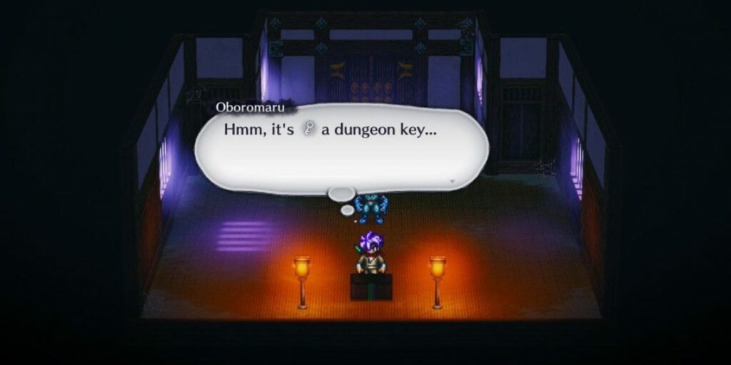 Come si evince dal nome stesso, la Chiave del Dungeon Key dà accesso al dungeon del periodo temporale Il Tramonto del Giappone Edo di Live A Live. Similmente alla precedente, questa chiave può essere difficile da individuare alla prima partita. Dalla stanza del secondo palazzo residenza sopra citato, dovrete tornare al primo edificio e, uscendo dalla porta centrale, camminare in direzione Sud verso la destinazione finale. Con una piccola deviazione prima di prendere quest’ultima direzione, potrete tuttavia scovare un piccolo tesoro utile ai fini della componente RPG: attraversando la porta shoji a destra e continuando a Nord, attraversate il ponte per trovare una porta che richiederà l’oggetto menzionato in precedenza. Qui si trovano più forzieri contenenti vari strumenti che potrebbero fare gola a molti giocatori.