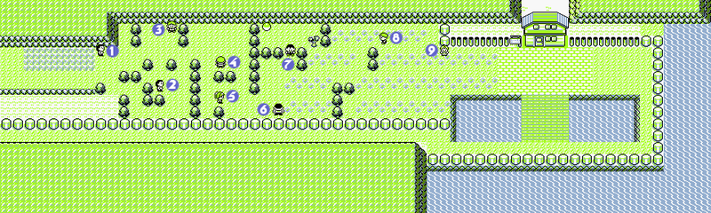 - Usate teletrasporto e tornate a Celestopoli, curate la vostra strada e tornate sul PontePepita. Questa volta girate a sinistra e salvate il gioco. Proseguite percorrendo il muro che da sull’acqua. L’allenatore che vi interessa è appena dietro l’angolo, dove sta l’erba. Dovrete piazzarvi davanti a lui ma senza entrare nel suo raggio d’azione