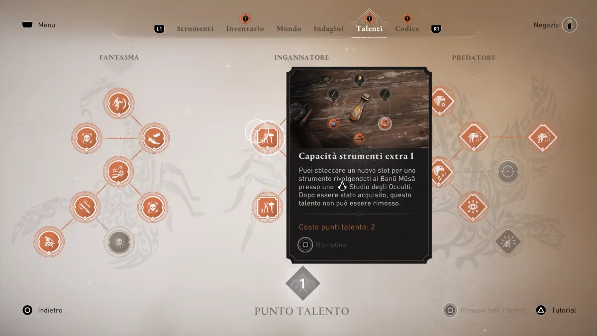 Capacità strumenti extra 1,2 e 3 – Ognuna di queste abilità ti dà un nuovo strumento sbloccato per i fratelli Banu Musa. Visita qualsiasi ufficio di Hidden One e parla con il relativo fratello Musa per sbloccare un altro strumento. Ottenere tutti e sei gli strumenti in anticipo è di grande aiuto poiché sono tutti molto utili, anche se tieni presente che non sarai in grado di sbloccare questa abilità finché non avrai progredito attraverso alcune missioni principali.