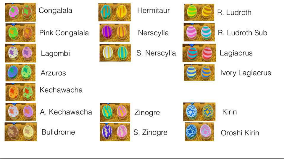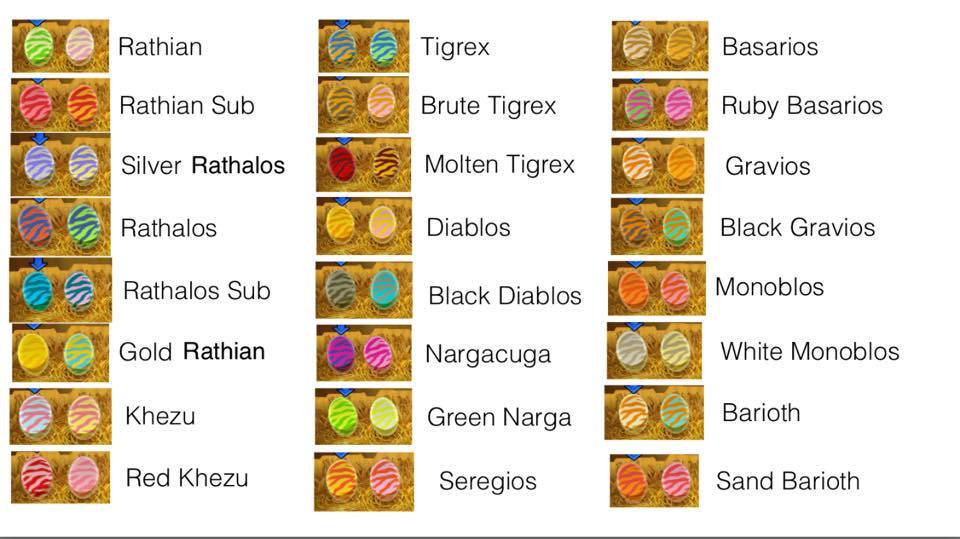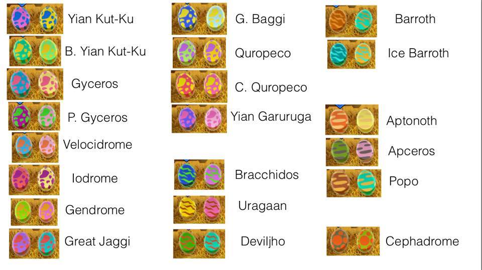 Monster Hunter Stories presenta una enorme quantità di mostri ottenibili, quasi la totalità di quelli presenti nell’universo della saga, se contiamo le sottospecie. In questa guida verrà spiegato come riconoscere l’esemplare del mostro che può sbucare dalle uova presenti nei nidi, ma anche come riconoscere l’eventuale rarità per ricavarne i migliori risultati. Partiamo dal presupposto che, come avrete notato, alcune tane nella mappa sono ricoperte da uno strato dorato. Tane di questo tipo indicano la possibilità di trovare un mostro raro sia come specie, sia per abilità. Per prima cosa, però, ecco un paio di immagini che vi torneranno utili per riconoscere il mostro già dal colore e pattern dell’uovo (cliccate sulle immagini per ingrandire):