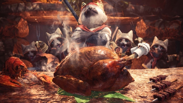 Mangiare in Monster Hunter World apporta dei temporanei ma enormi benefici al cacciatore. Oltre ad aumentare la barra della salute e della resistenza, avrete un notevole boost nei parametri a seconda del piatto scelto. Differentemente dai precedenti Monster Hunter, potrete mangiare anche durante la missione grazie all’assistente presente negli accampamenti. Infine, è altamente consigliato il completamento delle missioni affidate dallo Chef Miauscoloso, il capo cucina di Astera. Nuovi ingredienti verranno aggiunti al menù e di conseguenza migliori benefici e una maggiore probabilità di attivare alcune abilità date dal cibo.