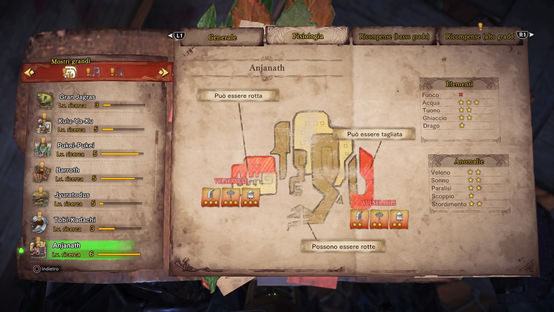 Come potete vedere nell’immagine appena mostrata, l’Anjanath è sensibilmente debole all’acqua, ma anche il tuono e il gelo fanno il loro sporco lavoro e possono essere delle ottime alternative se avete già craftato armi con tali elementi. Altrimenti, i buoni status saranno sempre i vostri alleati, in particolare veleno e paralisi. Inoltre, sebbene l’Anjanath abbia una coda – e solitamente questa è sempre sensibile alle armi da taglio – la testa è comunque il suo maggiore punto debole, che usiate armi da impatto, da taglio o munizioni da armi a lunga gittata.