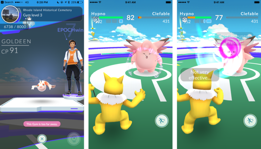 Il combattimento in Pokémon GO è ridotto all’osso. Sarà possibile combattere solo nelle palestre e il tutto si ridurrà solo a un continuo tap sullo schermo: premendo sul Pokémon nemico potrete sferrare un colpo, strusciando il dito lateralmente preformerete una schivata e tenendo premuto il dito sul vostro mostriciattolo (a patto che la barra blu sotto la vita sia piena) utilizzerete la sua abilità.