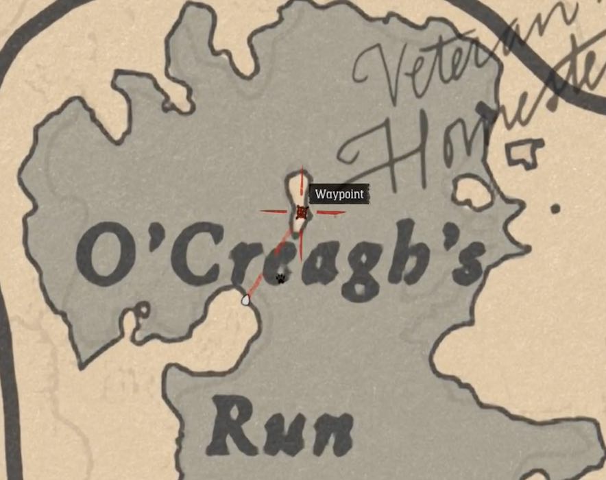 Raggiungete la posizione evidenziata dal target rosso per trovarvi al centro di alcune costruzioni artificiali fatte in pietra. Ispezionate quella centrale per ottenere l’ultima mappa della banda di Jack Hall. Questa volta è ritratto il lago O’Creagh’s Run, quello nei pressi del Ranch Emerald.