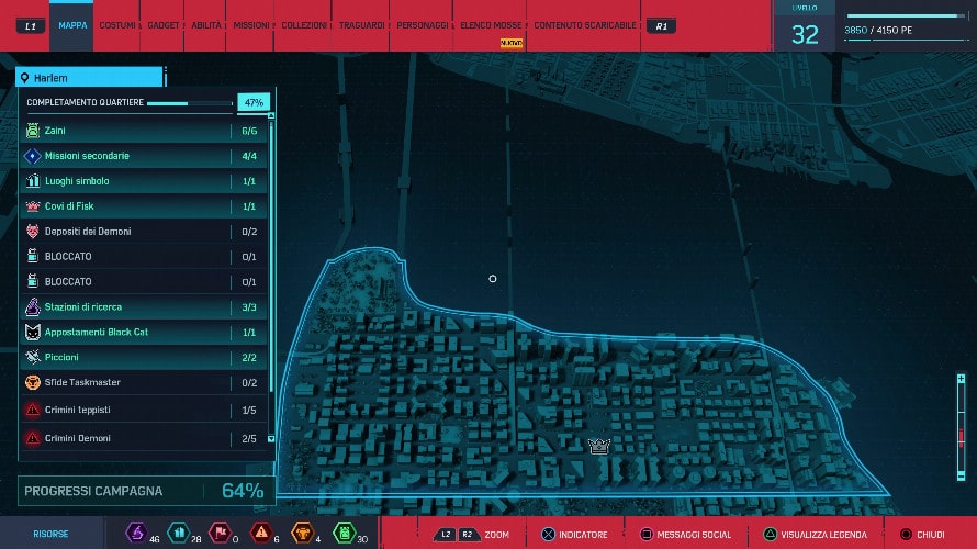 Il primo covo lo troveremo nel distretto di Harlem, seguendo il punto segnato sulla mappa in basso al centro. Una volta arrivati al punto indicato, arriveremo al cantiere di Fisk dove ci aspetteranno diversi scagnozzi pronti ad attaccarci senza sosta. Una volta eliminati tutti i nemici e finalmente liberato il cantiere dagli uomini d Fisk, riceveremo 2 gettoni base per utilizzarli all’interno del gioco. Riceveremo un gettone extra soddisfacendo i seguenti requisti: