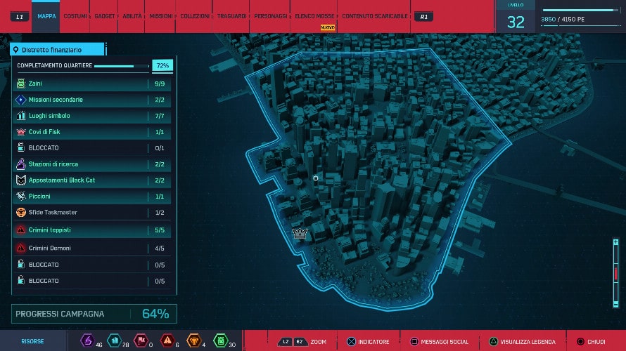 Il sesto ed ultimo covo lo troveremo nel Distretto Finanziario, seguendo il punto segnato sulla mappa in basso a sinistra. Una volta arrivati al punto indicato, arriveremo al cantiere di Fisk dove ci aspetterà finalmente l’ultima ondata di nemici. Una volta eliminati tutti e liberato finalmente il cantiere, oltre al trofeo per aver sgominato tutti i covi di Fisk, riceveremo 2 gettoni base per sbloccare nuovi costumi e interessanti gadget. Riceveremo un gettone extra una volta soddisfatti i seguenti requisti: