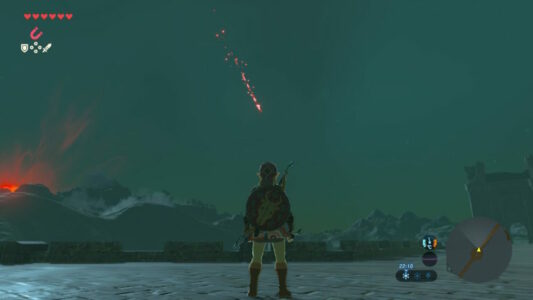 La quest inizia a farsi più complicata con il secondo indizio, in cui ci viene chiesto di recarci verso est dall’orbita sinistra del teschio. Se apriamo la mappa di Hyrule e guardiamo nella parte nord-est verso le Terre di Akkala, è possibile notare un luogo chiamato Stagno Testadimorto la cui forma è quella di un teschio. E nell’occhio sinistro di quella testa (il destro se visto dall’alto) c’è il Sacrario di Zuna Kai. Quello è esattamente il punto in cui bisogna andare per guardare poi verso est. Seguite la traiettoria della stella rossa e recuperate il Gilet da recuperatore.