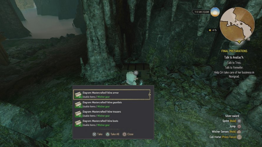 Questo è la penultima variante del set della scuola del Gatto di The Witcher 3. Lo schema si trova nell’isola principale di Skellige (per intenderci, quella più estesa), in una caverna ad est di Rogne. Precisamente, lo schema si trova a destra dell’entrata della caverna in questione.