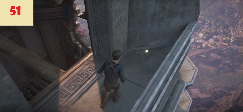 Prima di interagire con la campana gigante, usate le sporgenze per arrampicarvi più in alto possibile per trovare un muro crollato. Sul balconcino a destra troverete il tesoro.