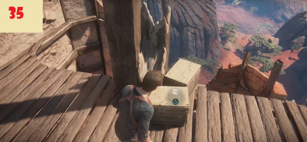 Ad un certo punto vi troverete ad un bivio, con un muro quasi distrutto sulla destra. Girando vi troverete davanti un punte nello stesso stato. A sinistra del ponte vi sarà una piattaforma su cui saltare per ritrovarsi appesi al lato opposto del muro di prima. Scendendo troverete il tesoro.